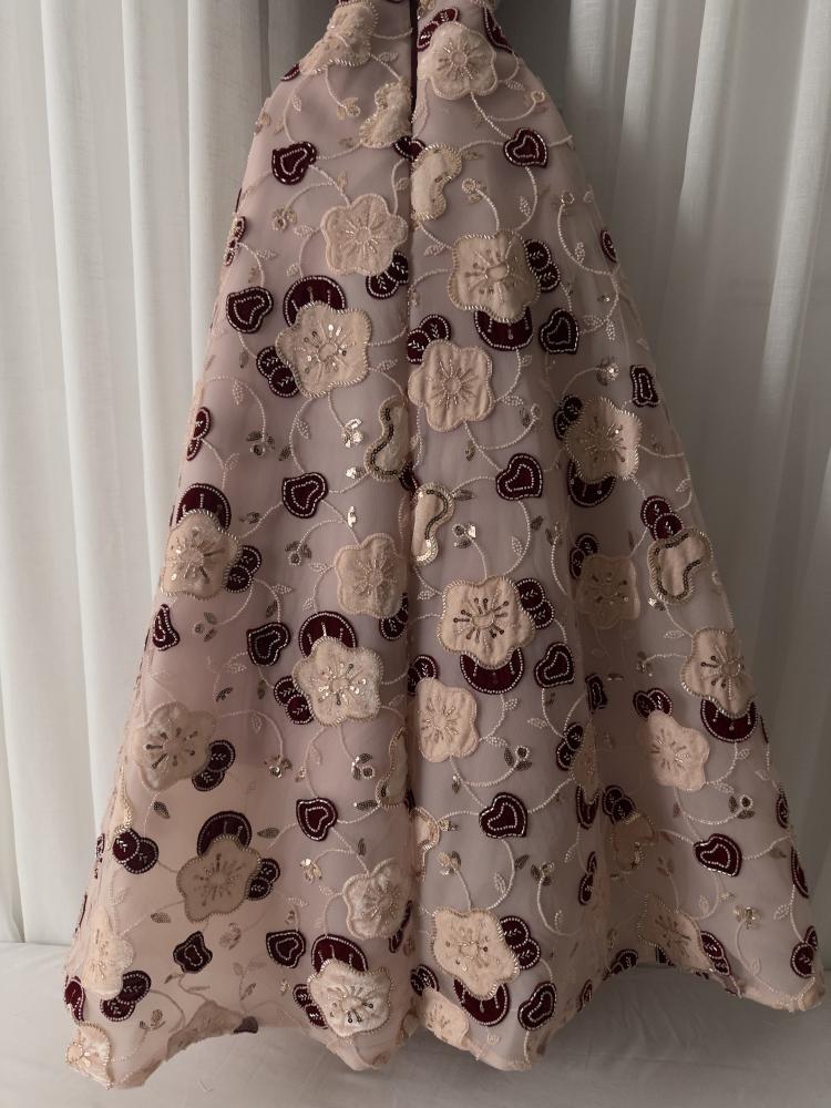 فستان بنعومة أنثوية راقية، الجزء العلوي مخملي بلون خمري فاخر بقصّة أنيقة بدون أكمام. يأتي بتنورة منفوشة بطول كامل من قماش مطرّز بالورود بلمسات لامعة تضيف فخامة وجاذبية. إطلالة مثالية للمناسبات الراقية.