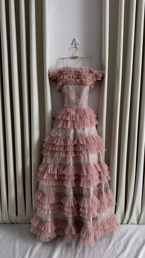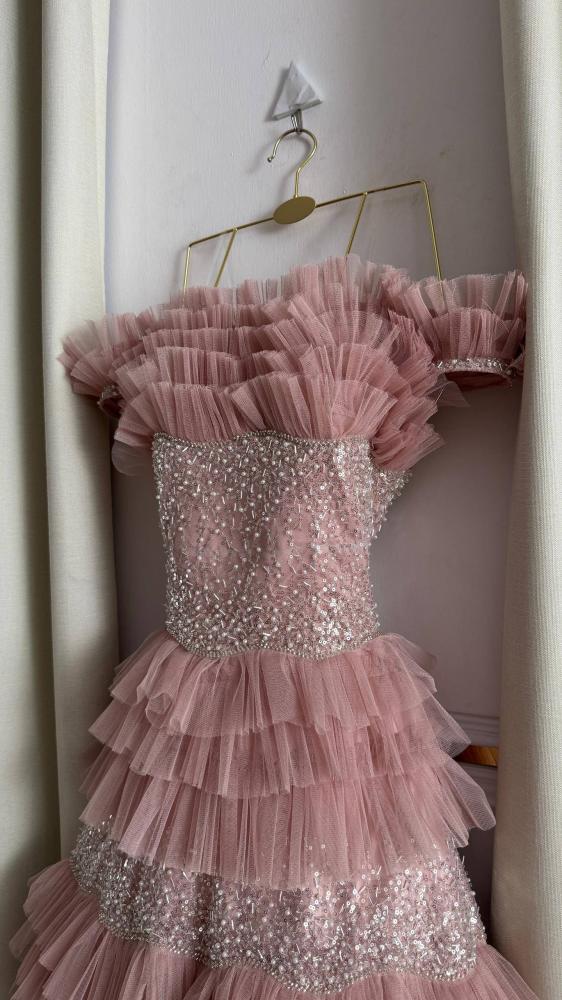 فستان وردي طويل مصنوع من طبقات تول ناعمة، مزين من الصدر إلى الخصر بتطريز جميل مع لؤلؤ بسيط يضيف لمسة ناعمة وأنثوية