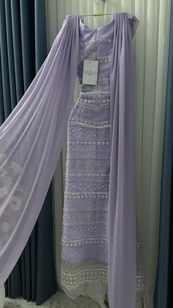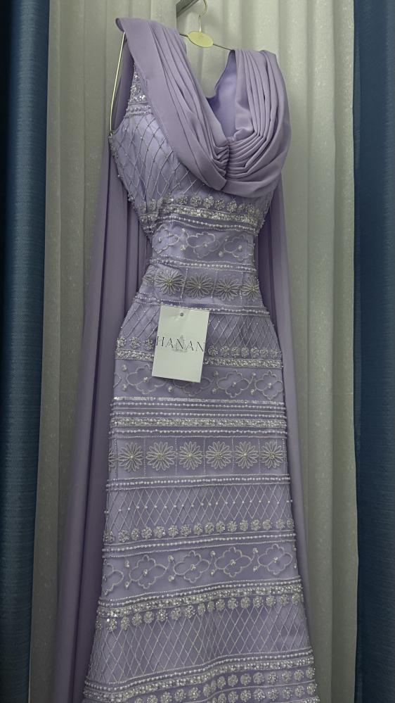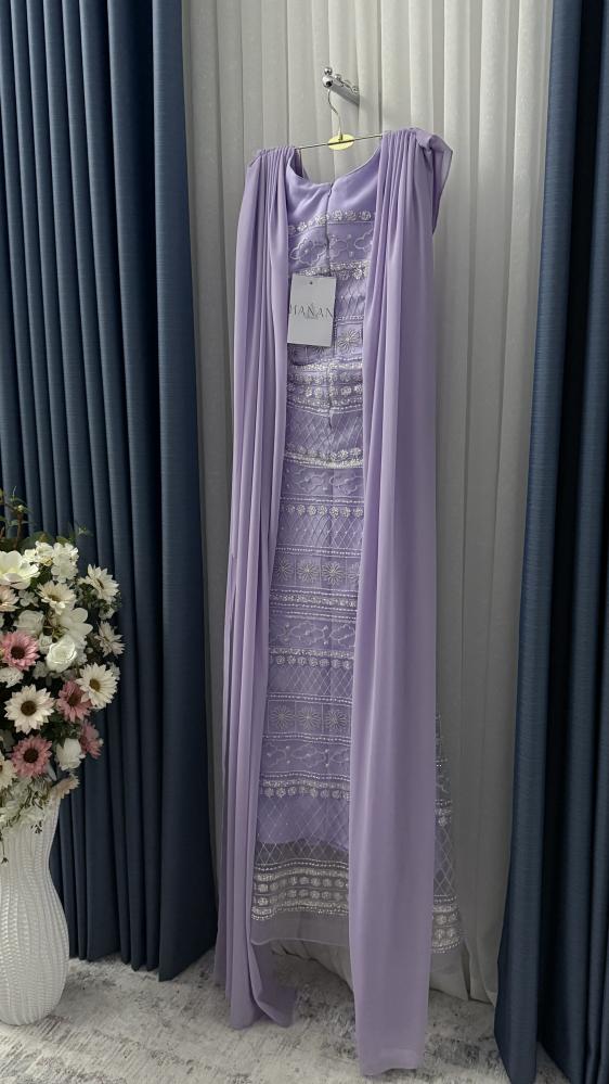 لونه بنفسجي فاتح رايق، بتطريزات دقيقة على كامل القماش بأشكال هندسية وزهور صغيرة. الصدر مزين بقماش منسدل يعطيه شكل راقٍ ومميز.