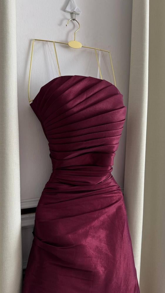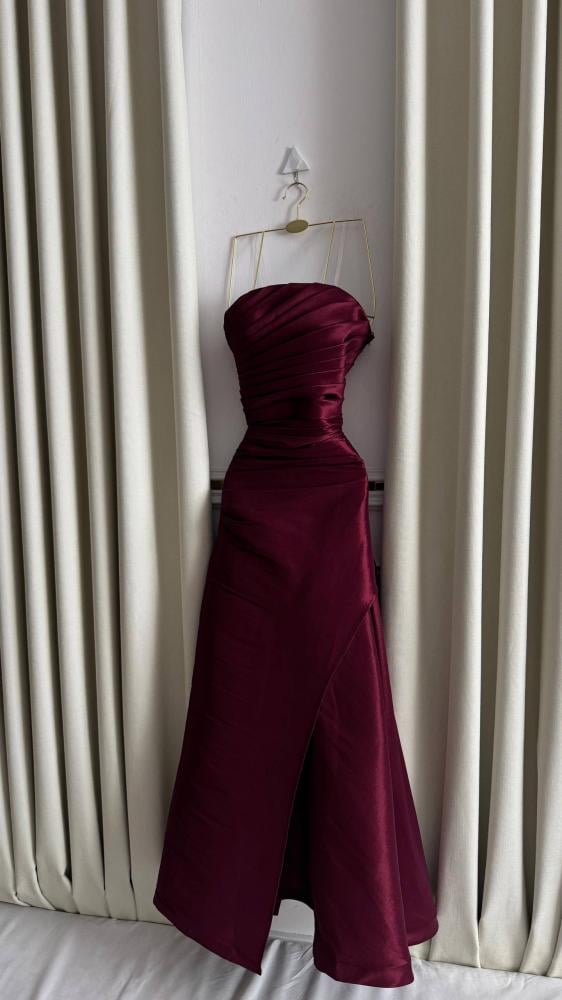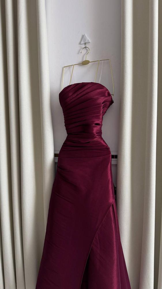 فستان بلون عنّابي غامق، بتصميم ناعم وأنيق من دون أكمام، يتميز بقماش لامع خفيف يبرز القَصّة بشكل جميل، وطوله متوسط مع فتحة أمامية تضيف له لمسة أنوثة ورُقيّ