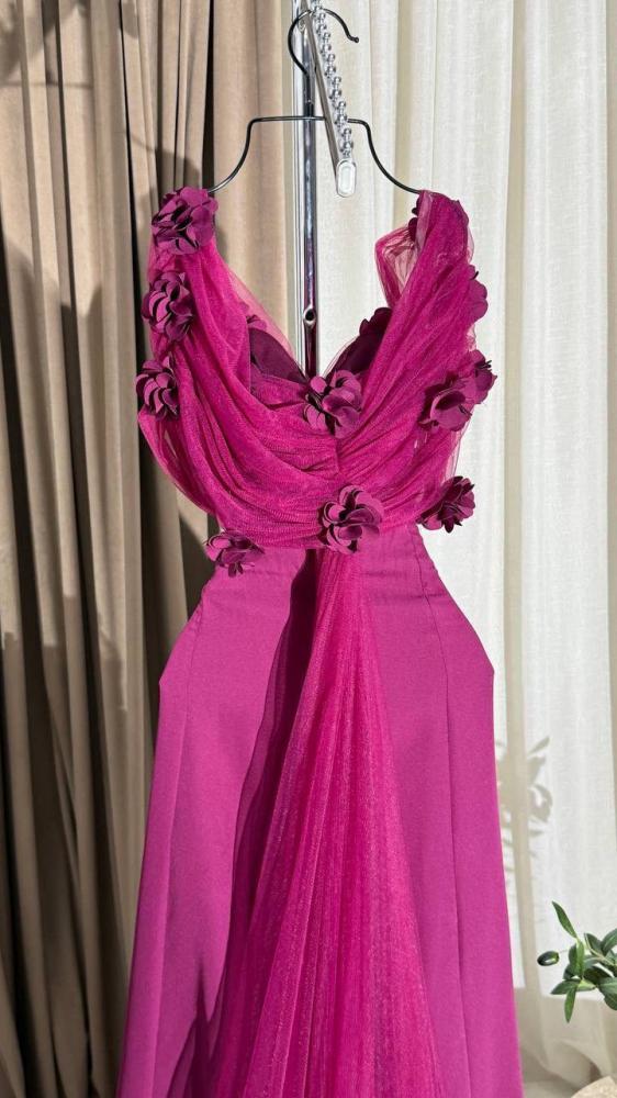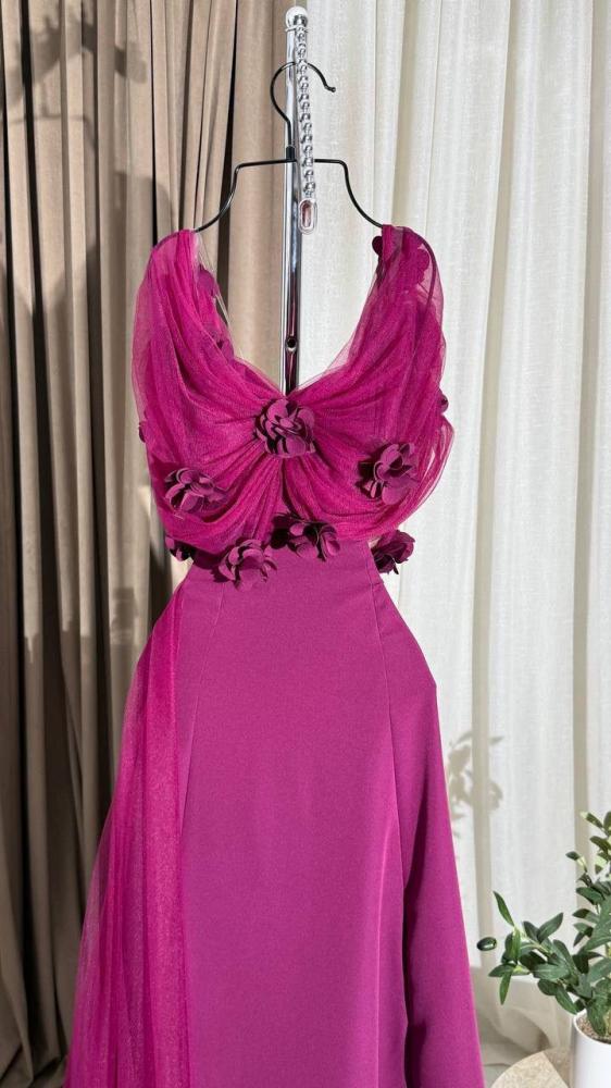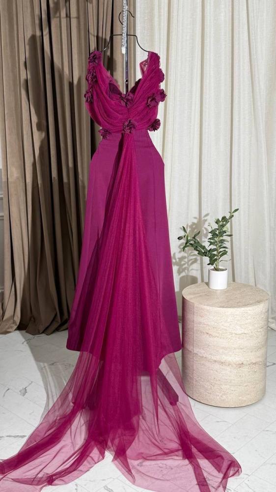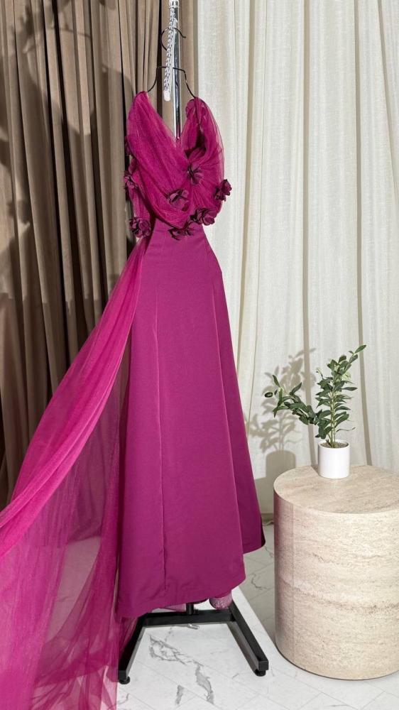 فستان سهرة طويل بلون فوشي، يمنحه الحيوية والأناقة. يتميز الجزء العلوي بتفاصيل مكشكشة من التل مزينة بزهور قماشية بارزة على الأكتاف. بقماش ناعم مع ذيل طويل وشفاف من التل يتدفق من الخلف، مما يجعله فستاناً حالماً وملفتاً للأنظار.