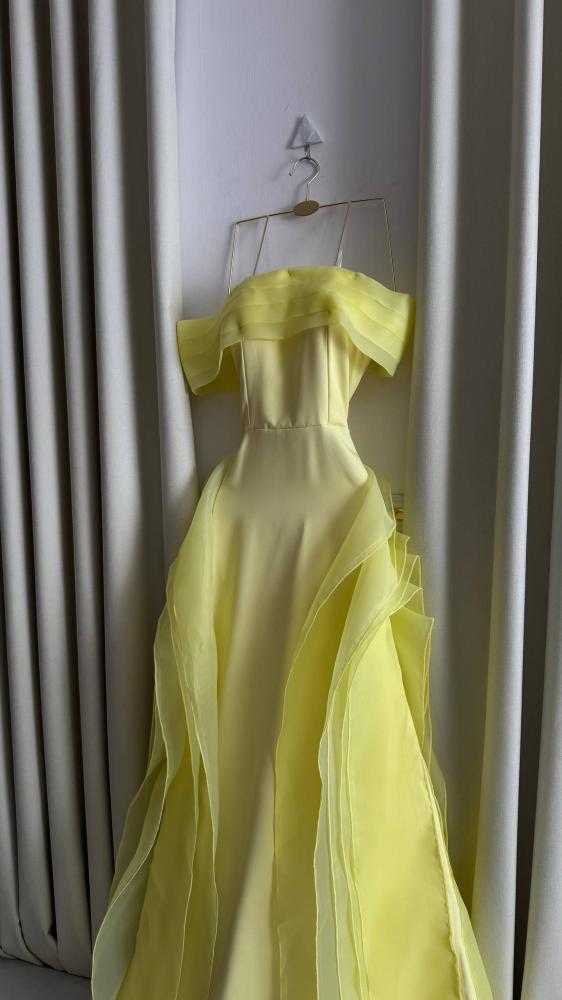 فستان طويل بلون الأصفر،يزدان بأكتاف مكشوفة لمسة فخمة وجذابة