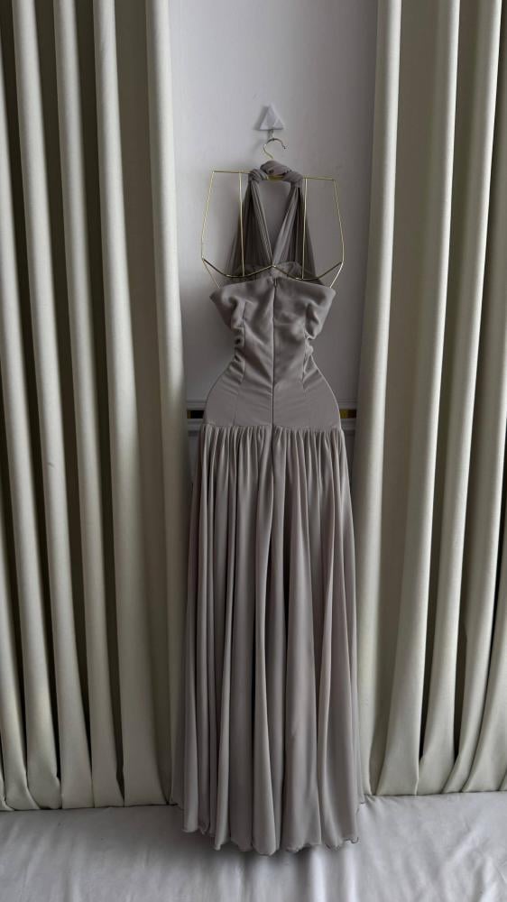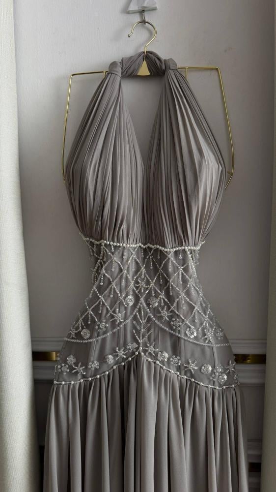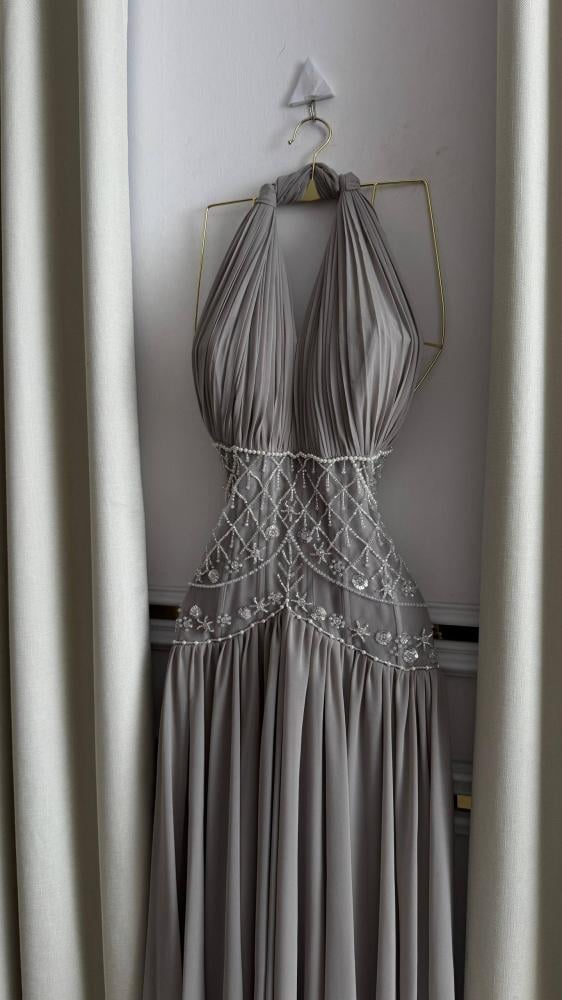 فستان سهرة طويل بلون رمادي فاتح (Taupe) أو لحمي باهت ودافئ. يتميز بقصة أنيقة مع ربطة حول الرقبه وفتحة صدر على شكل حرف V. يزدان الفستان بتطريز رقيق من الكريستال أو الخرز الأبيض يحدد محيط الخصر على شكل شبكي أو متموج، بينما بقماش خفيف ومكسر يعطيها انسيابية ورقة.